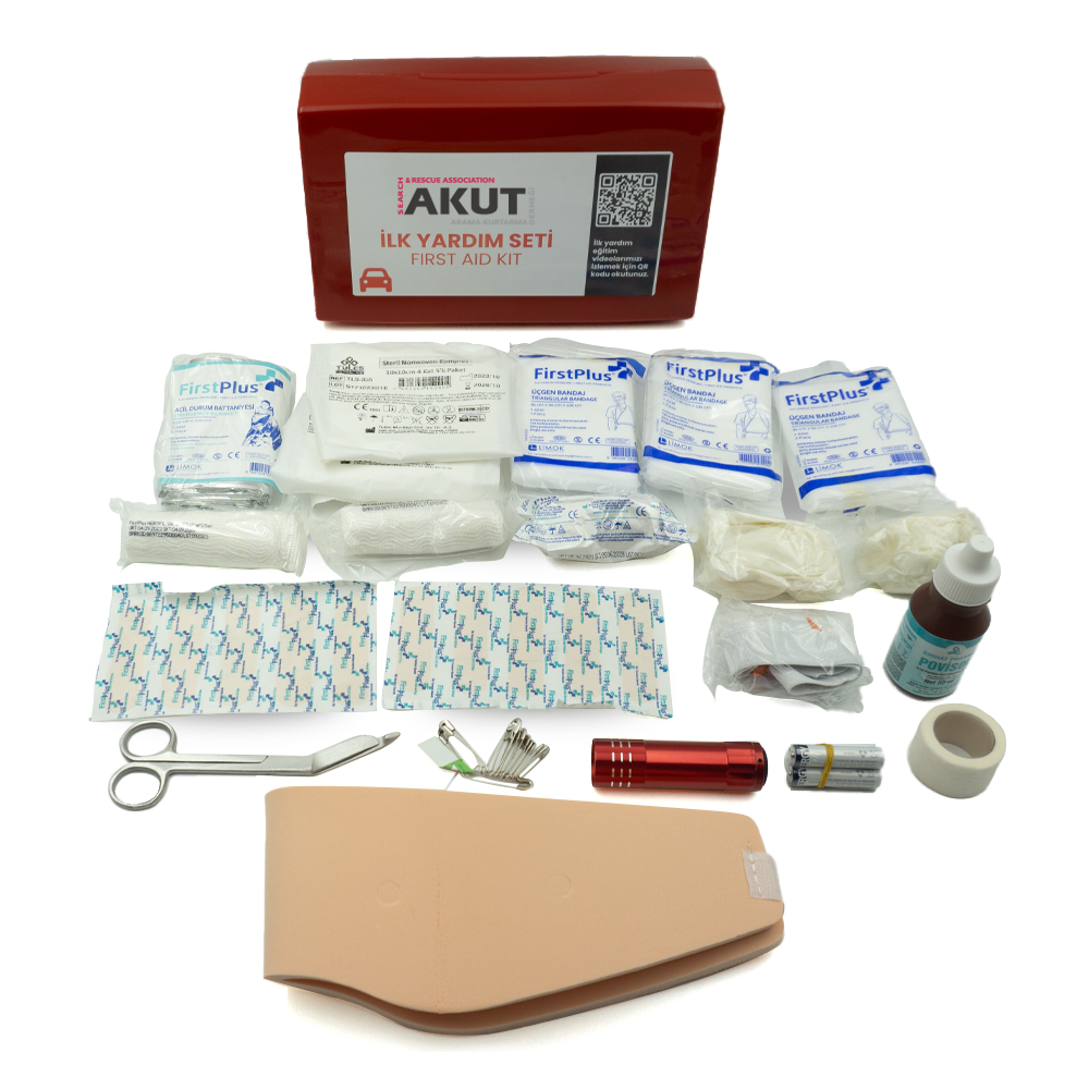 AKUT araç ilk yardım setimiz, yaralanmalarda yardımcı olabilecek plaster, yara bandı, sargı bezi, bandaj, kompres, makas gibi temel ilk yardım ürünlerinin yanı sıra solüsyon, acil durum battaniyesi, alkollü mendil, turnike gibi ekstralar da içerir.